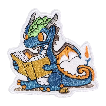 Roztomilá vyšívaná nášivka s motivem dráčka čtoucího knihu, která