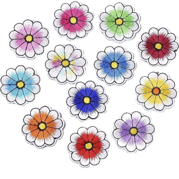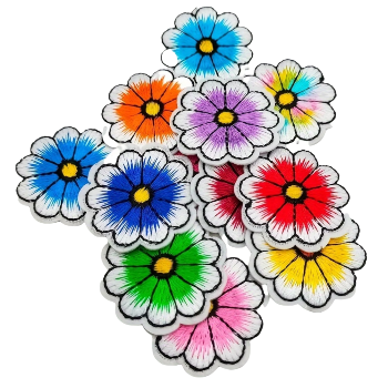 Veselá nažehlovací nášivka zobrazující barevnou kytičku, která
