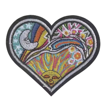 které zachycuje obrys srdce vyplněný sluncem, měsícem, duhou a květinami