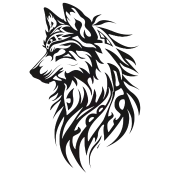 hlavu vlka s detailním konturovým zpracováním, které zdůrazňuje